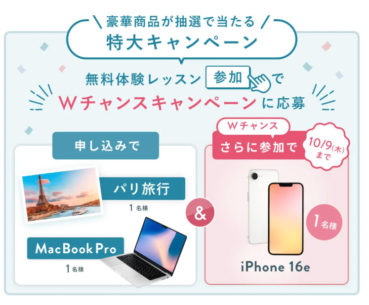 - 2.17 無料体験レッスン参加でMacBookPro・ハワイ5日間など豪華商品が当たる!【2023年5月31日まで】